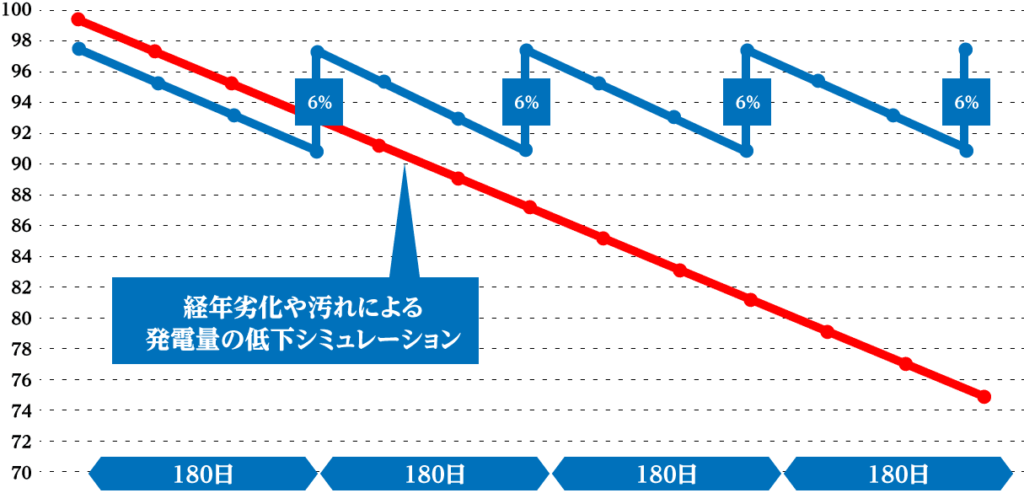 機器を健全に保つことで発電量をキープし、故障の要因を減らせるようメンテナンスすることが大切です下の図は、汚れによってどれくらい発電量が低下するのかシミュレーションしたものです。